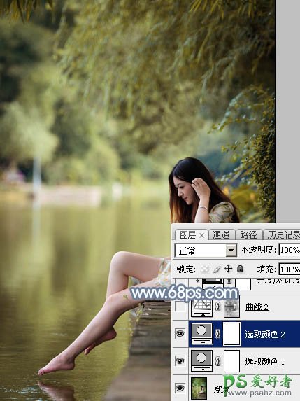 Photoshop给外景自拍的长腿美足少女生活照调出柔和的古典青蓝色,素材图片主色为黄绿色,调色的时候先把绿色转为青绿色;然后把黄绿色转为橙黄色;再给暗部增加蓝色,高光区域增加淡青色;后期局部渲染一些高光,加上暗角,加强一下局部明暗即可。
