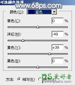 6、创建可选颜色调整图层,对黄、青、蓝进行调整,参数设置如图16 - 18,效果如图19。这一步把图片中的黄色转为橙红色。