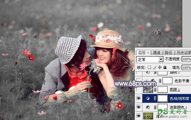 PS婚片后期调色:给草丛中的唯美婚片写真图片调出梦幻的中性蓝灰