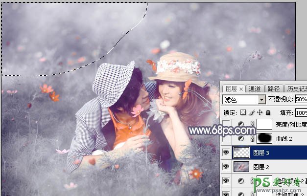 9、用套索工具选取下图所示的选区,羽化65个像素后按Ctrl + J 复制到新的图层,混合模式改为“滤色”,不透明度改为:50%,效果如下图。