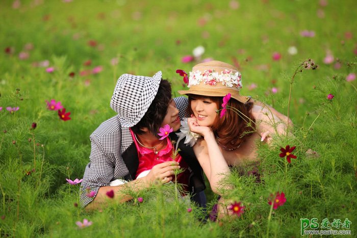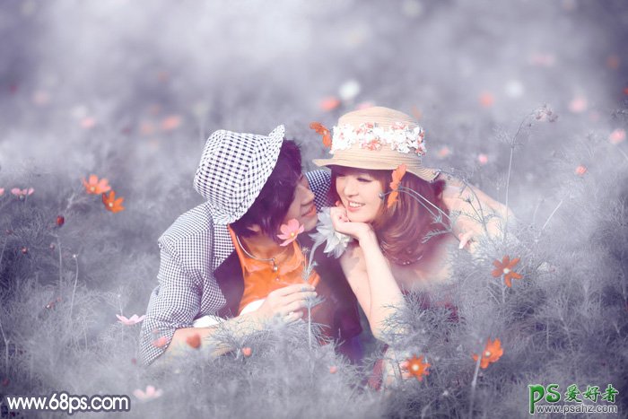 PS婚片后期调色:给草丛中的唯美婚片写真图片调出梦幻的中性蓝灰色,我们的婚纱照素材图片拍摄的很一般,色彩也不是梦幻的感觉,处理的时候先把主色转为比较简洁的中性色或淡色;然后用云彩滤镜及模糊滤镜增加梦幻效果;最后微调人物肤色,加强局部明暗即可。 原图