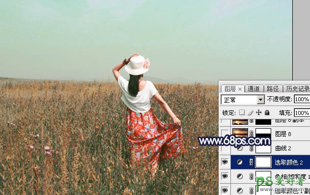 PS美女温馨图片调色:给草原上自拍的唯美女生图片调出意境霞光效