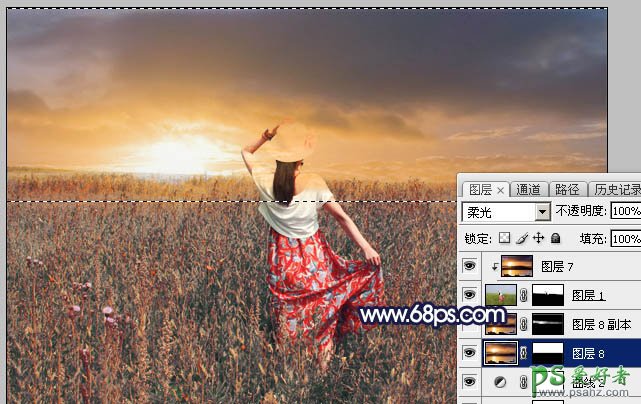 12、把霞光图层复制一层,移到背景副本图层的下面,混合模式改为“柔光”,按住Alt键添加图层蒙版,用白色画笔把下图选区部分擦出来,如下图。