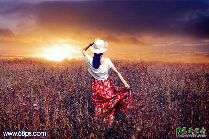 PS美女温馨图片调色:给草原上自拍的唯美女生图片调出意境霞光效