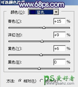 15、创建可选颜色调整图层,对蓝、洋红、中性、黑进行调整,参数设置如图33 - 36,效果如图37。这一步微调图片中的冷色。