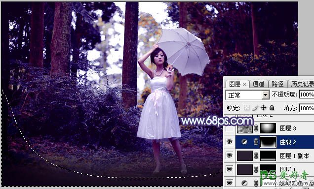 9、创建曲线调整图层,对RGB通道进行调整,把暗部调暗一点,确定后把蒙版填充黑色,用白色画笔把底部及边角部分擦出来,效果如图27。