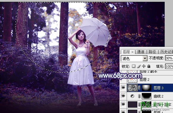 10、新建一个图层,按字母键“D”把前,背景颜色恢复到默认的黑白。选择菜单:滤镜 > 渲染 > 云彩,确定后把混合模式改为“滤色”,不透明度改为:30%。按住Alt键添加图层蒙版,用白色画笔把下图选区部分擦出来,效果如下图。这一步给图片局部增加高光。