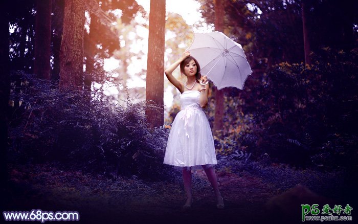 Photoshop给森系唯美女生图片制作出唯美紫色透射阳光的效果,密林深处自拍的美女写真照让人看了本身就有一种神秘的感觉,今天我们把素材图调出一些秘境般的紫色风格,再加上一缕阳光透射出来,让美女图更显大气,推荐给大家学习一下。