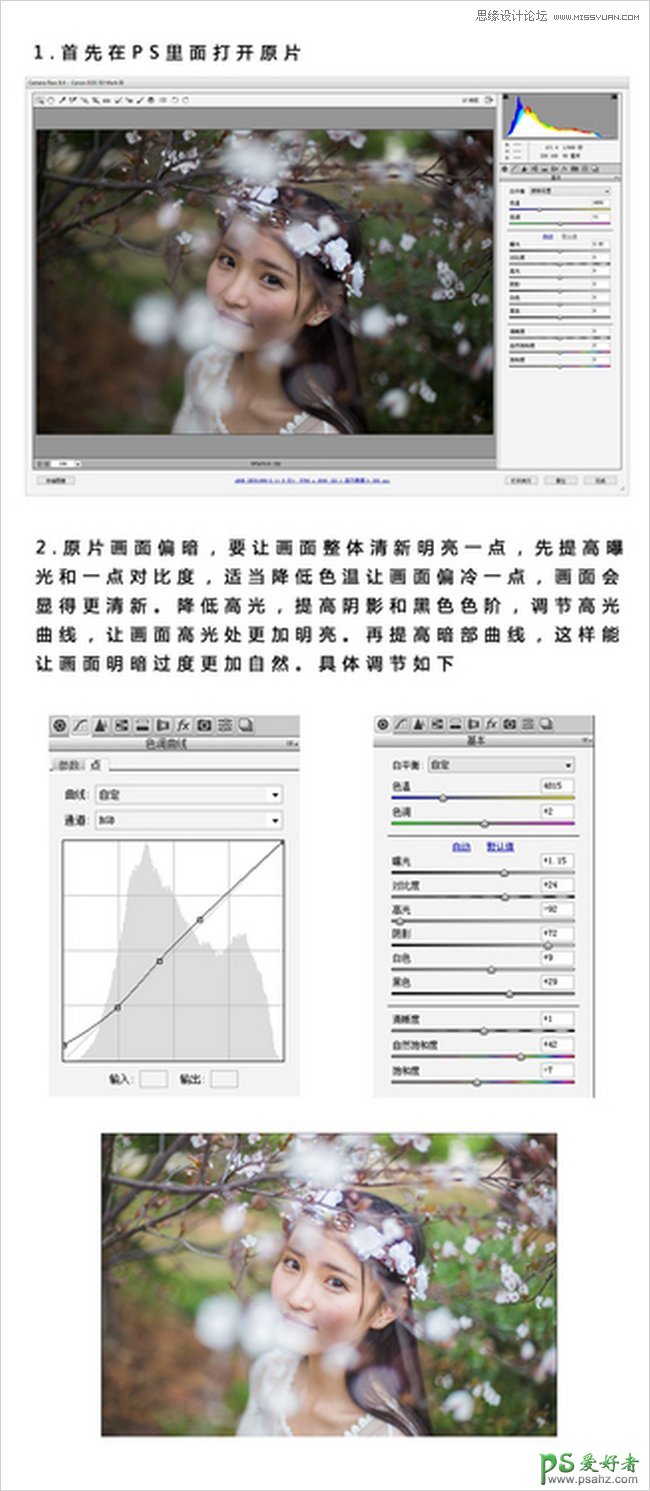 Photoshop给桃花下的花语少女唯美图片调出甜美通透肤色效果,花与少女这组作品受到一些女生的喜爱。摄影师米果MiG将自己后期的一些思路与方法整理成了一份教程。有技术含量又非常简单,具有很强的可操作性。 效果图: 原片与效果图: 调整步