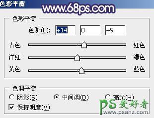 7、按Ctrl + Alt + 2 调出高光选区,然后创建色彩平衡调整图层,对阴影、中间调、高光进行调整,参数设置如图21 - 23,效果如图24。这一步给图片高光部分增加橙黄色。