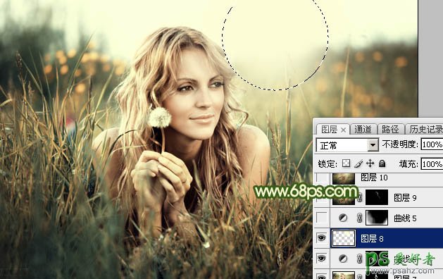 11、新建一个图层,用椭圆选框工具拉出下图所示的选区,羽化35个像素后填充淡黄色:#FCFCD6,取消选区后效果如下图。