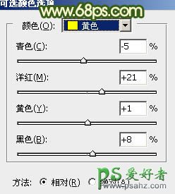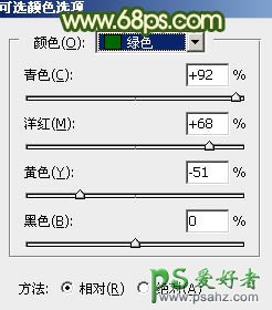 1、打开素材图片,创建可选颜色调整图层,对黄色,绿色进行调整,参数及效果如下图。这一步把图片中的黄绿色调暗一点。