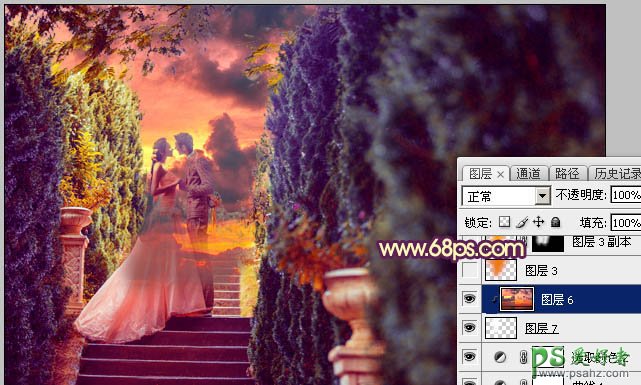 6、打开天空素材,拖进来,按Ctrl + Alt + G 创建剪切蒙版,调整好位置,如图20。
