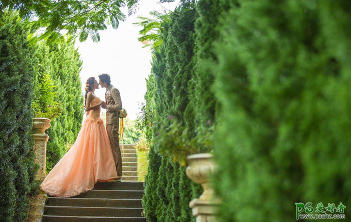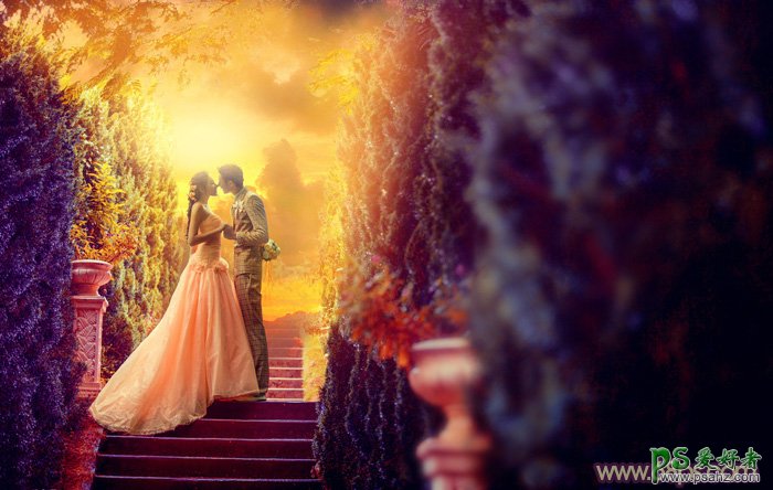 PS婚片调色教程:给唯美的情侣婚片外景照调出黄调华丽的霞光色,这样的色彩看上去非常大气,上档次,影楼里工作的调色师都非常喜欢的色彩,也是我们很多年轻男女们的最爱,我们通过学习可以举一反三调出自己心爱的,喜欢的色调,推荐给大家练习一下。