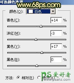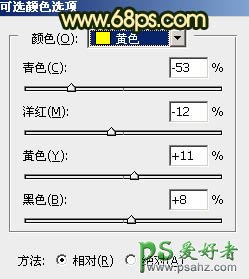2、创建可选颜色调整图层,对黄、绿、白、中性、黑进行调整,参数设置如图5 - 9,效果如图10。这一步给图片增加橙黄色。