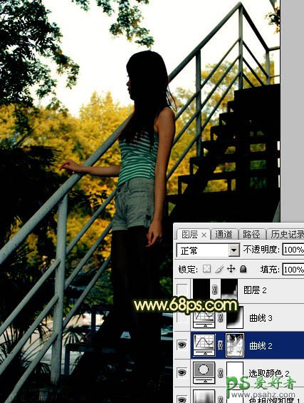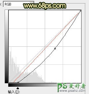 6、按Ctrl + Alt + 2 调出高光选区,按Ctrl + Shift + I 反选得到暗部选区,然后创建曲线调整图层,对RGB,红通道进行调整,参数及效果如下图。这一步把暗部颜色大幅压暗,并增加绿色。