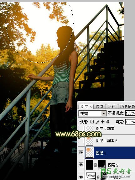 9、现在来给图片增加阳光效果。 新建一个图层,用椭圆选框工具拉出下图所示的椭圆选区,羽化45个像素后填充橙红色:#E99003,取消选区后把混合模式改为“变亮”。