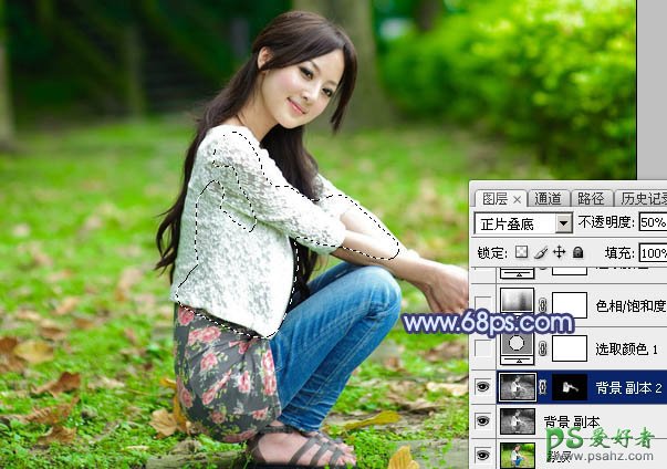 2、按Ctrl + J 把当前图层复制一层,不透明度改为:50%,按住Alt键添加图层蒙版,用白色画笔把人物衣服过亮的部分擦出来,效果如下图。这一步修复衣服过曝的部分。