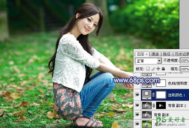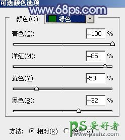 3、创建可选颜色调整图层,对黄色,绿色进行调整,参数及效果如下图。这一步把图片中的黄绿色转为暗绿色。