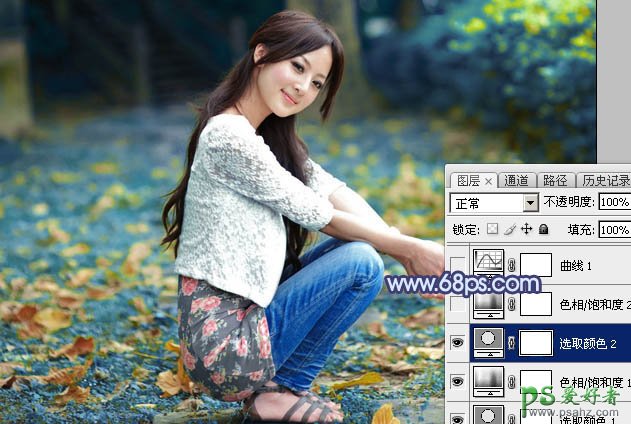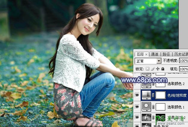 4、创建色相/饱和度调整图层,对绿色进行调整,参数及效果如下图。这一步把图片中的绿色转为青蓝色。