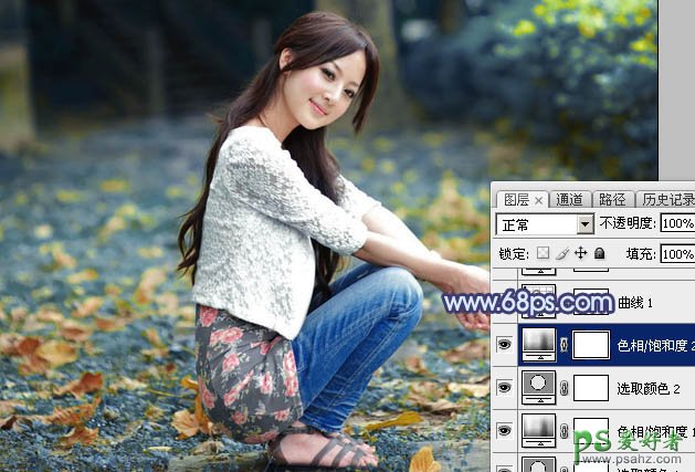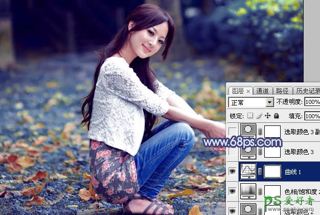 7、创建曲线调整图层,对RGB、绿,蓝通道进行调整,参数及效果如下图。这一步把暗部稍微调暗,并增加蓝色。