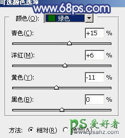 1、打开素材图片,创建可选颜色调整图层,对黄、绿,黑进行调整,参数设置如图1 - 3,效果如图4。这一步给图片增加绿色。