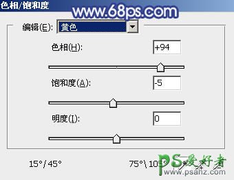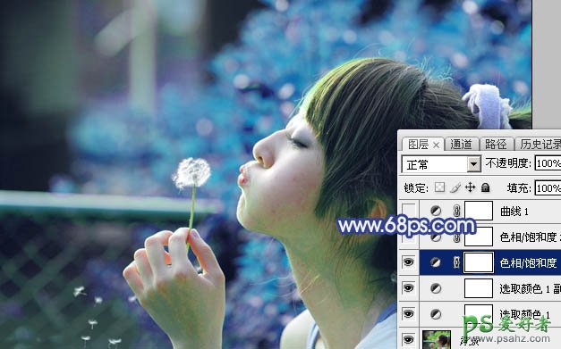 3、创建色相/饱和度调整图层,对黄色,绿色进行调整,参数设置如图6,7,效果如图8。这一步快速把图片中的黄绿色转为青蓝色。