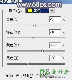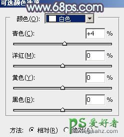 6、创建可选颜色调整图层,对黄、绿,白进行调整,参数设置如图16 - 18,效果如图19。这一步把图片中的黄绿色稍微调淡一点。