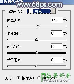 10、创建可选颜色调整图层,对红、黄,白进行调整,参数及效果如下图。这一步给图片增加淡红色。