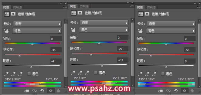4、创建"色相饱和度调整层",把画面饱和度过高的,红色、黄色、青色降低一点,使画面偏向于冷色,