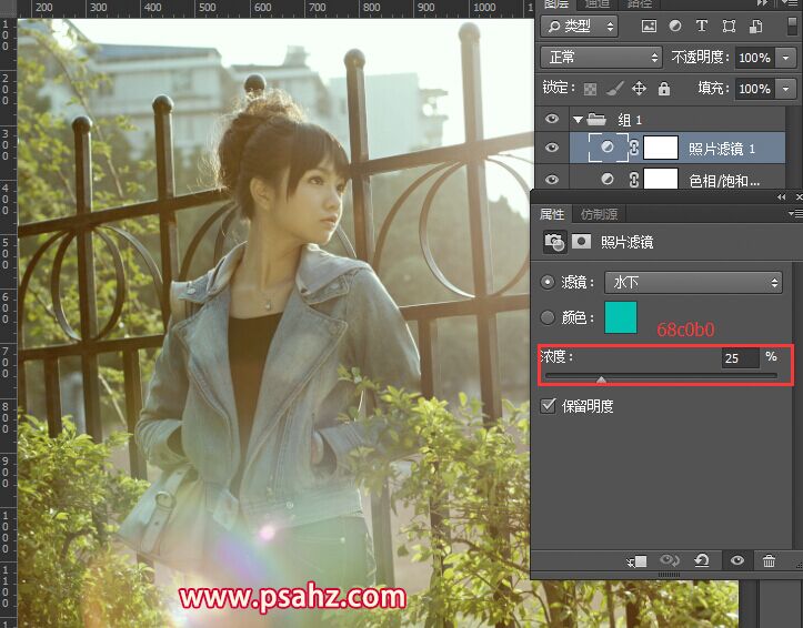 调整层",选择“水下滤镜”,使的画面偏向于冷色,参数设置如图: