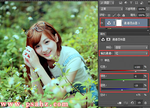 混合器",红通道调在降低,绿色/蓝色/通道。统一画面色调,