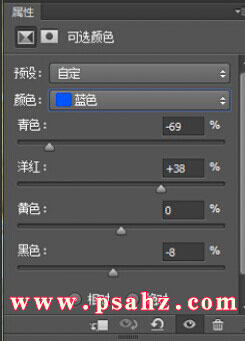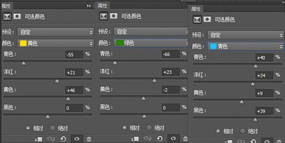 3、创建"可选颜色调整层",调整/黄色/绿色/青色/蓝色,参数设置如图: