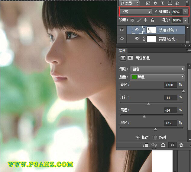 3、创建"可选颜色调整层",调整、绿色、白色,设置参数如下: