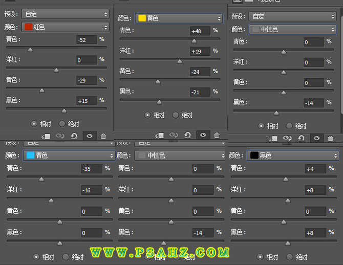 5、创建"可选颜色调整层",参红色、黄色、青色、中性色、黑色、