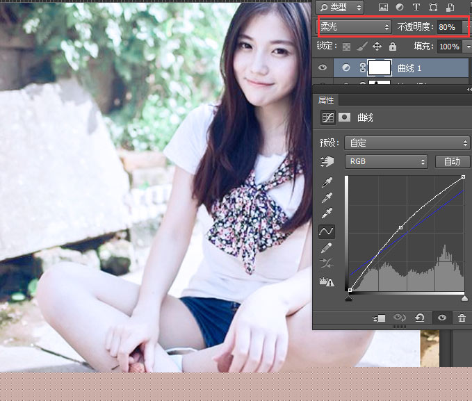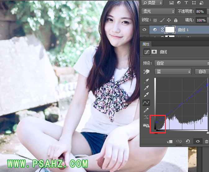 4、创建"曲线调整层",提亮暗部,增加暗部蓝色,混合模式 柔光,不透明度 80