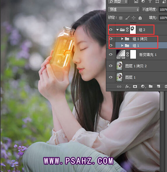 3、把颜色层 ctrl+G编组 、再复制一层编组、添加蒙板擦除瓶身周围颜色,