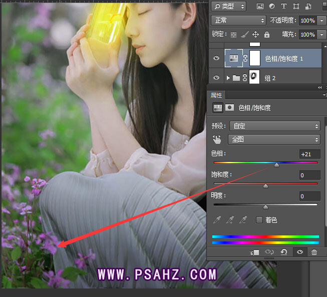 4、创建"色相饱和度调整层",选择饱和度-21、调整花朵颜色。设置参数如图: