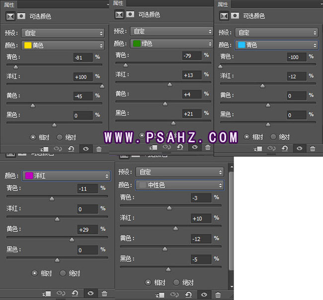 5、创建"可选颜色调整层,黄色、绿色、青色、洋红色、中性色、分别颜色值为下面图。