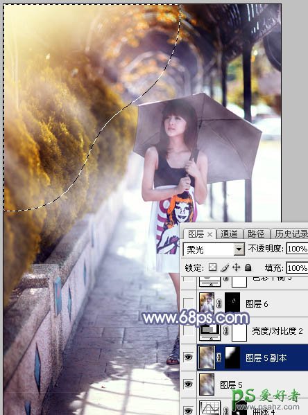 15、用套索工具选取下图所示的区域,羽化50个像素后按Ctrl + J 复制到新的图层,效果如下图。