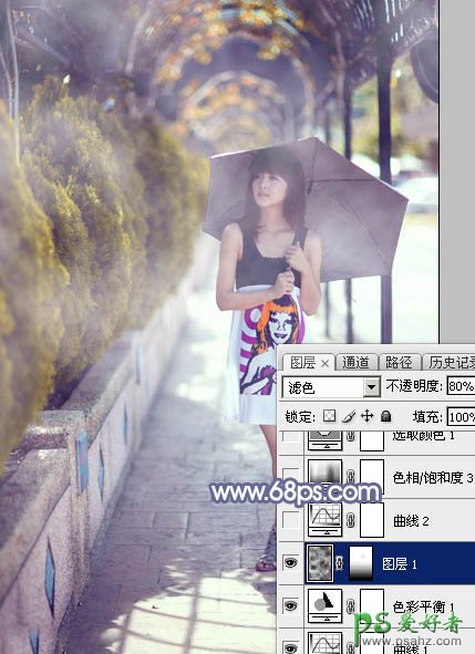 5、新建一个图层,按字母键“D”把前,背景颜色恢复到默认的黑白,然后选择菜单:滤镜 > 渲染 > 云彩,确定后把混合模式改为“滤色”,不透明度改为:80%。添加图层蒙版,用黑色画笔把底部区域擦出来,效果如下图。