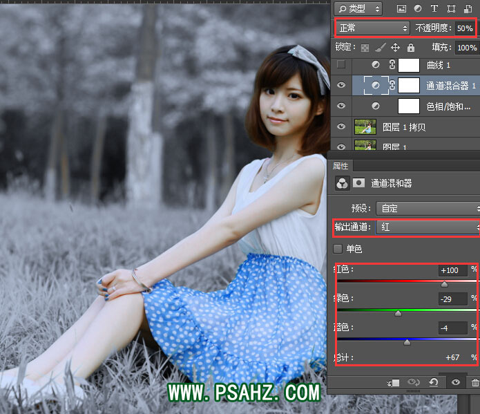 混合器调色层、设置红色通道、绿色通道、颜色值。不透明度-50