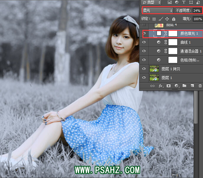 5、创建"可颜色填充调整层,填充白色,柔光、不透明度-24