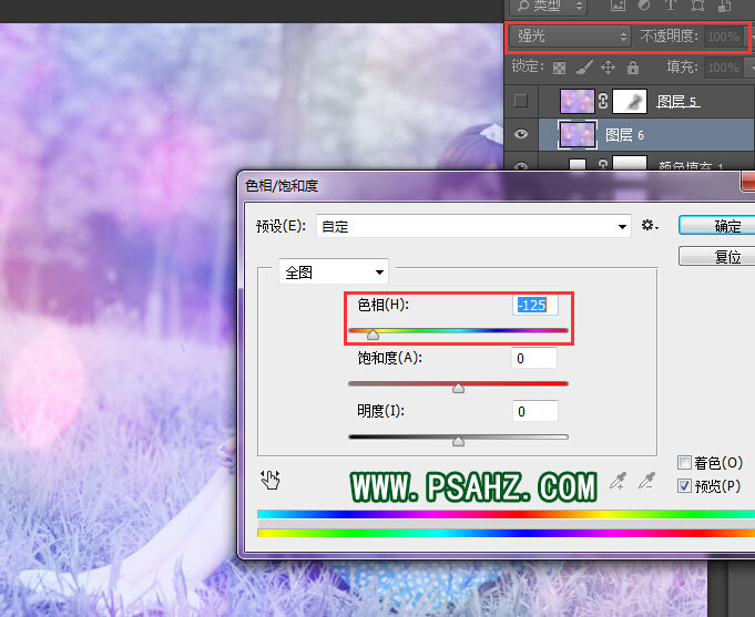 6、此时把准备好的光斑素材拖入画布中,进行色相饱和度调、整把素材融入画面中去。