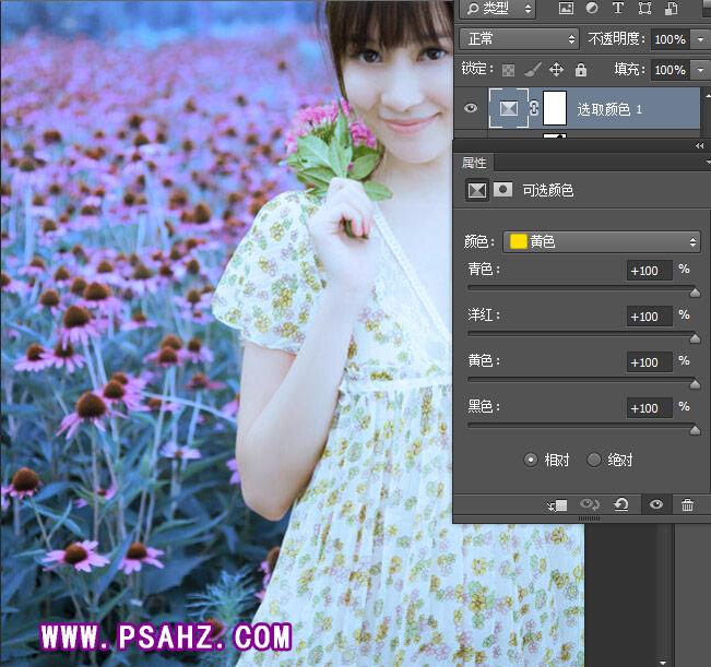 Photoshop给花草地中自拍的梦幻少女摄影照片调出唯美的紫色调