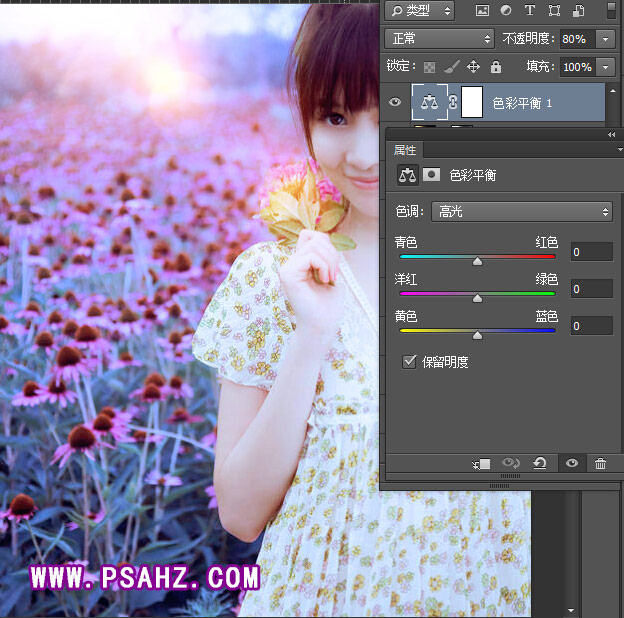 Photoshop给花草地中自拍的梦幻少女摄影照片调出唯美的紫色调