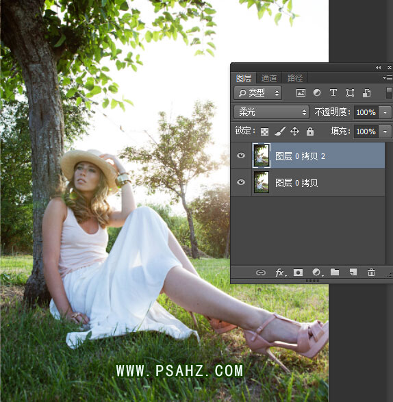 1、打开素材,将人物复制一层,将混合模式为-柔光、