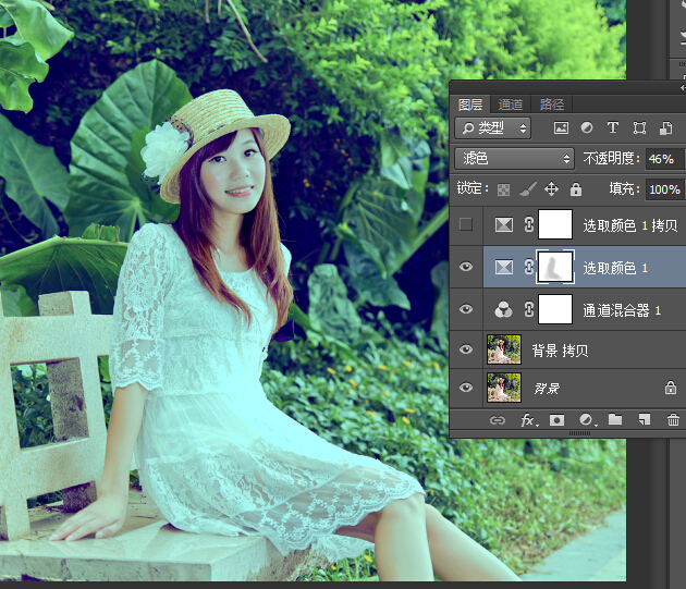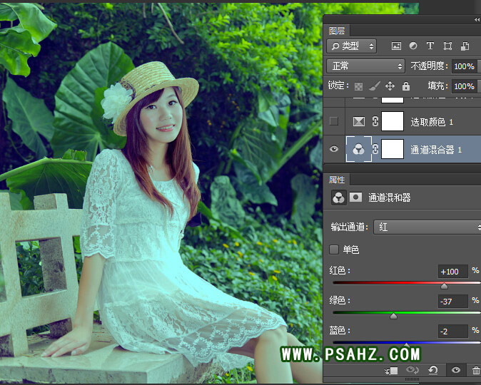 1、打开素材,将人物复制一层,创建通道混合器调整层,对红通道进行调整,这一步把画面黄 色转为绿。