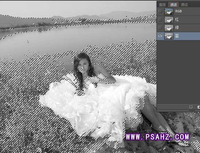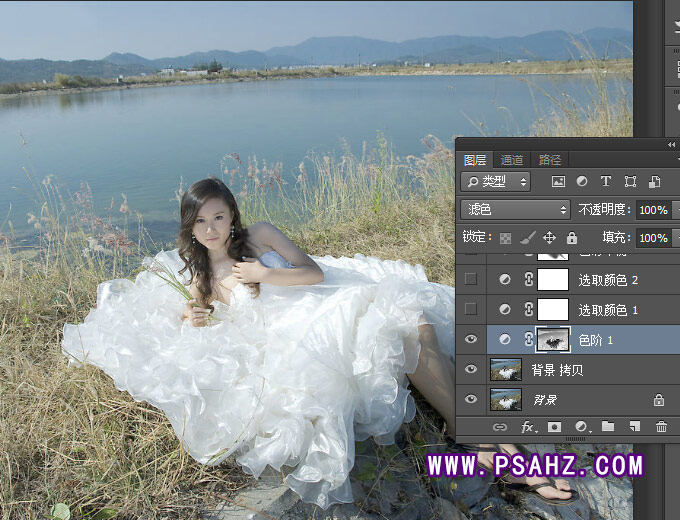 大家好!今天教程是 Photoshop调色教程学习,把外景美女婚纱照调出漂亮唯美紫色调。 原图 最终效果图 具体学习步骤: 1、打开素材,将人物复制一层,选择通道蒙板,ctrl 载入蓝通道选区,反向选区得到暗部选区, 回到图层创建色阶调整