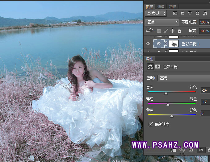 Photoshop调色教程学习:把外景美女婚纱照调出漂亮唯美紫色调